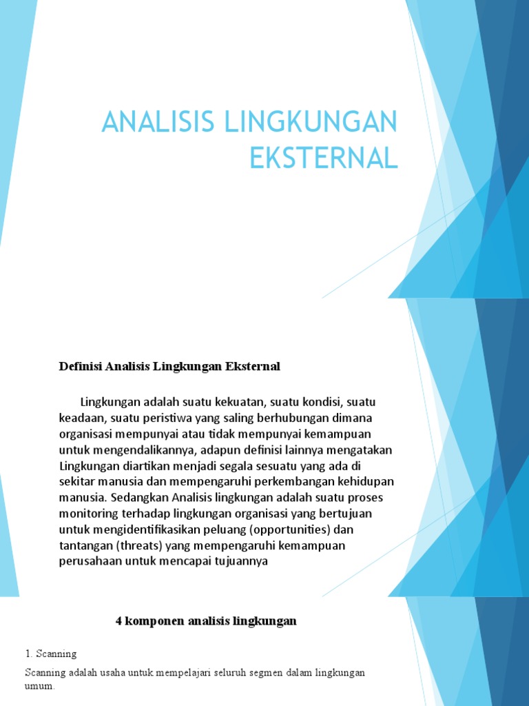Tujuan dan Peran Analisis lingkungan. ANALISA LINGKUNGAN EKSTERNAL Menurut Jauch dan Glueck 2 00352 pengertian analisis lingkungan adalah suatu proses yang digunakan perencana strategis untuk memantau sektor lingkungan dalam menentukan peluang atau ancaman terhadap perusahaan. Salah satu proses dalam konsep manajemen adalah menyusun factor penentu keberhasilan yang diawali dengan mengkaji lingkungan strategis yang meliputi kondisi situasi keadaan peristiwa dan pengaruh-pengaruh yang berasal dari dalam maupun dari luar suatu organisasi atau unit satuan wilayah baik pada.